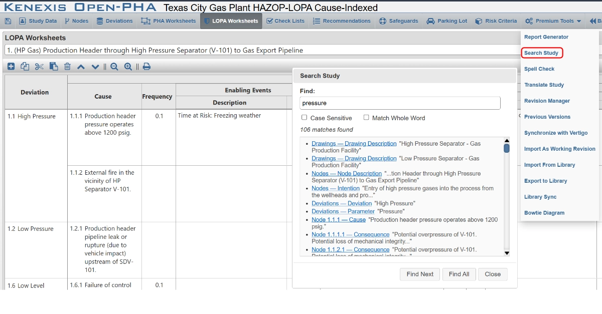 Unlock Deeper Insights with Open-PHA®’s New “Search Study”We are excited to announce the latest addition to our Premium Tools in Open-PHA®: Search Study. As safety professionals know, navigating extensive Process Hazard Analysis (PHA) files to find specific nodes, deviations, or safeguards can be a time-consuming challenge. Our new “Search Study” feature directly addresses the searchability of your file, giving you instant access to the critical data you need throughout your entire study. Why Search Study is a Game-ChangerWe developed this feature to tackle two of the most critical workflow challenges our users face: